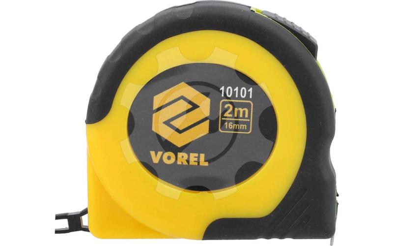 Svinovací metr 2 m dlouhý a 16 mm široký zakončený pohyblivým háčkem. Pouzdro je vyrobeno z plastu, vyztuženo gumovými podložkami a aretačním knoflíkem.