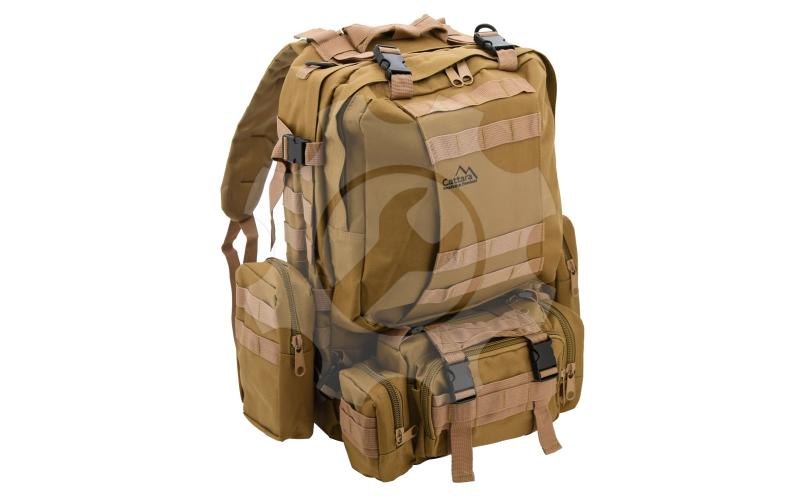 Zhotovení ze 100% polyesteru s voděodolnou PVC vrstvou z vnitřní strany. Batoh má rozměry 50 x 52 x 26 cm a nabízí objemný prostor až pro 55L předmětů. Na čelní straně a na bocích je doplněný o sumky, které lze jednoduše sundat, či umístit na jiné místo s Molle vazbou.