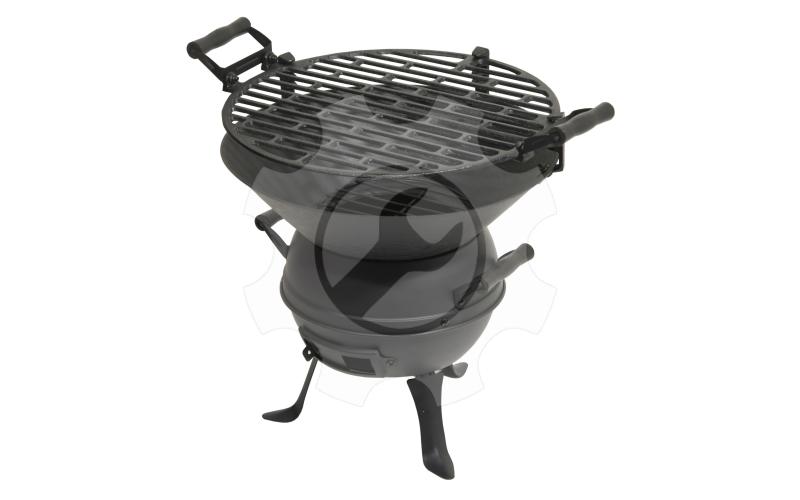 Konstrukce je vyrobena z litiny s černěným povrchem. Dřevěná madla zajistí pohodlný úchop pro nastavení roštu, nebo přenášení celého zařízení. Stabilitu zajištují tři kovové nohy, připevněné ke grilu ve spodní…