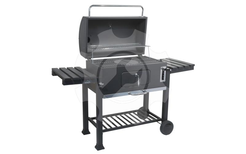 Ovládací kovové prvky a rukojeti mají dostatečné rozměry pro pohodlný úchop a zajišťují snadnou manipulaci. Oboustranná ocelová regulace ventilace perfektně lícuje s konstrukcí. Vyklápěcí víko je ve vrchní části doplněné komínem a navíc je opatřené teploměrem pro stálou kontrolu teplot uvnitř grilu.