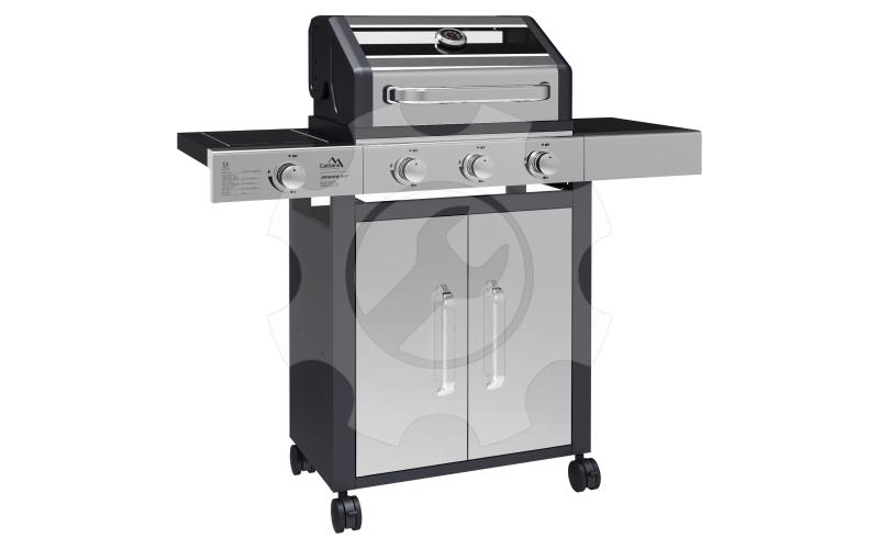 Sklopné víko grilu je opatřeno průzorem, díky kterému je možné sledovat stav grilovaných pokrmů bez otevírání grilu. Gril je vybaven odkládacími poličkami na obou stranách, z nichž jedna je doplněna o boční vařič. Součástí je i spojovací hadice k plynové lahvi a redukční ventil.