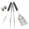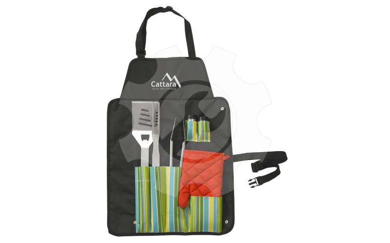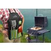 Sada nářadí a zástěry pro grilování, skládající se ze zástěry opatřené kapsami a slánkou, s pepřenkou, rukavicí a klasickými nástroji jako obracečka, vidlička a kleště.
