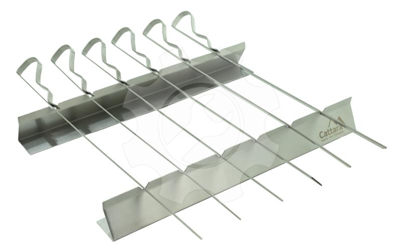 Podstavec je dvoudílný s délkou 35 cm a sílou plechu 1,2 mm. Oba díly lze umístit podle velikosti špízů, což zajišťuje maximální flexibilitu při grilování. Podstavce umožňují umístit špízy do drážek ve výšce 3 cm, takže se rovnoměrně propečou ze všech stran. Drážky navíc usnadní otáčení.