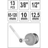 Jednotlivé misky mají zakončení velikosti 3/8". Souprava obsahuje 11 miskových klíčů, nastavitelný klíč s rozsahem 63 - 102 mm a redukci 3/8" - 1/2“.