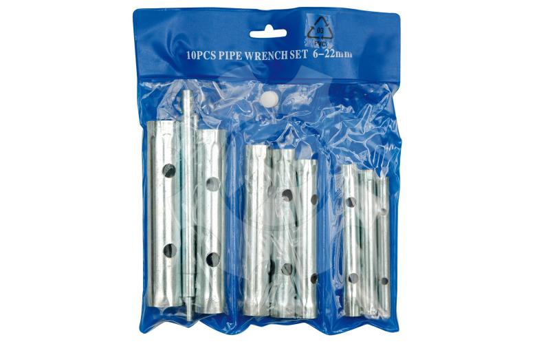 Sada oboustranných trubkových klíčů o rozměrech 6-22 mm. Vyrobeny z uhlíkové oceli.