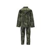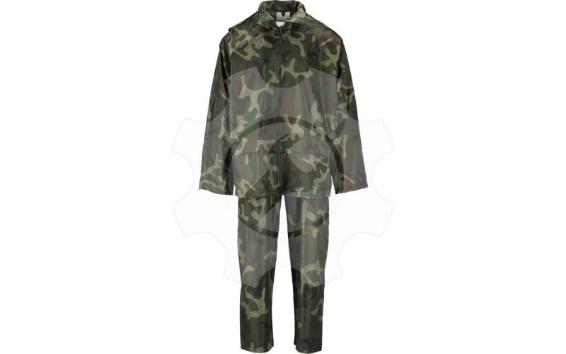 Maskáčová 2-dílná deštivzdorná sada kalhot a bundy. Bunda se dvěma velkými kapsami a nastavitelnou kapucí, kalhoty s elastickým pasem a rozparky na bocích, kterými se dostaneme do kapes kalhot. Směs PVC a polyesteru je voděodolný a vzduchotěsný materiál. Přebytečné teplo uniká zpod materiálu ventilačními štěrbinami na zádech a otvory pod pažemi.