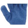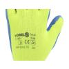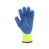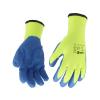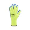Zateplené pracovní rukavice z jasně žlutého polyesteru, potažené na úchopové části modrým latexem s porézní strukturou.