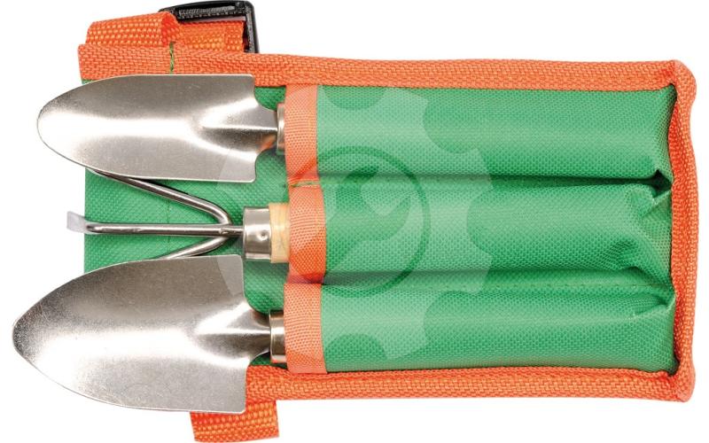 Sada zahradnického náčiní skládající se ze dvou lopatek a kultivátoru. Perfektní pro úpravu záhonků. Náčiní uloženo v praktickém pouzdře.