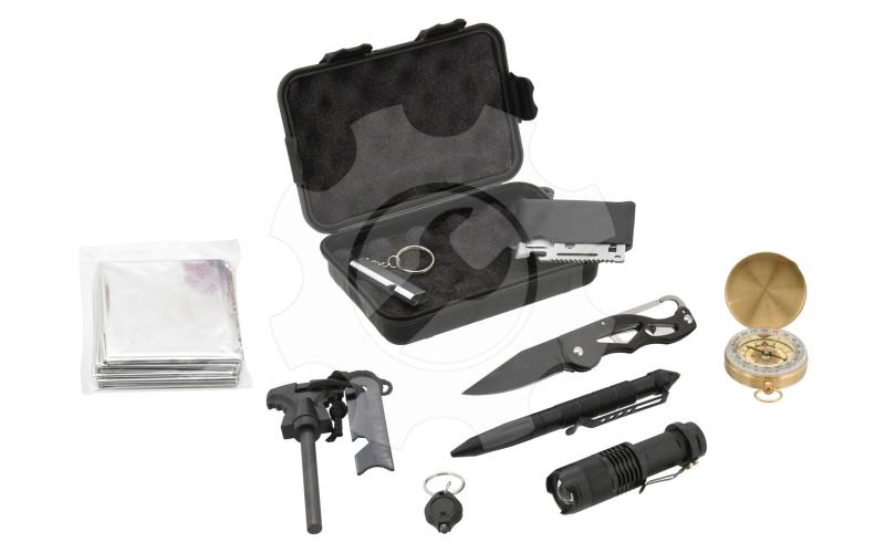 SOS sada je složena ze zavíracího nože s čepelí délky 6,5 cm, multifunkční karty, píšťalky, kompasu s otočnou stupnicí, bivakovací (izotermické) fólie, rozměrného křesadla pro zapálení ohně, přívěškem s LED osvětlením, celokovovým perem s průrazným hrotem a LED svítilnou napájenou AA baterií (není součástí balení) s nastavitelným kuželem vysoce výkonného světla. Vše je uloženo v ochranném, uzavíratelném pouzdře.