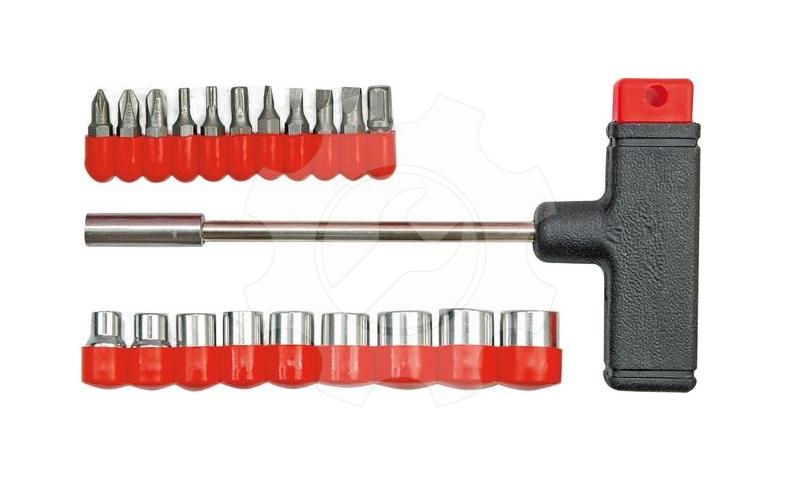 Šroubovák ve tvaru "T" v sadě nástrčnými klíči a bity.