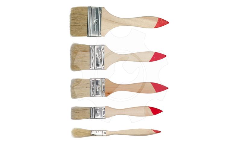 Sada pěti plochých štětců anglického typu. Štětiny orámované kovovou objímkou ??na dřevěné lakované rukojeti.