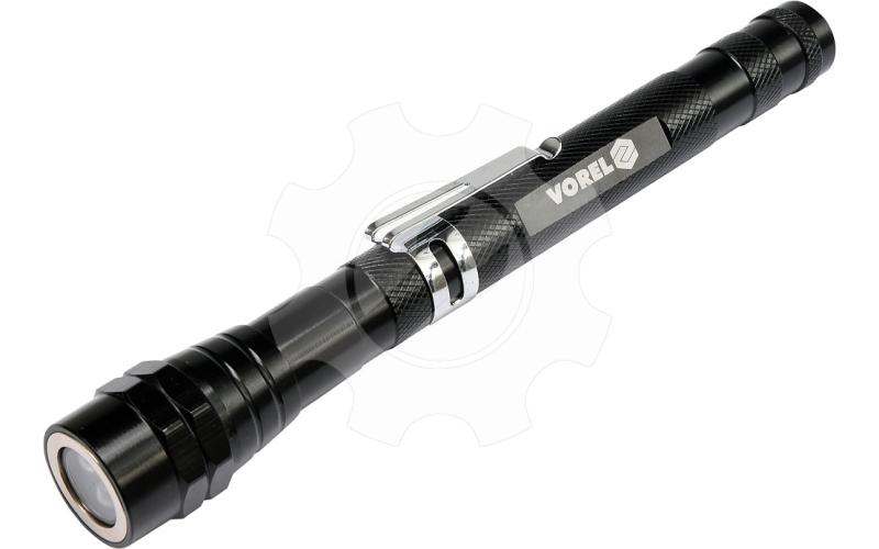Celokovová teleskopická LED svítilna, s klipsem na opasek a s magnetem pro opevnění. Svítilna je v místě LED diod osazena magnetickým kroužkem, díky kterému lze snadno vytáhnout kovové předměty (např. šroubky) i z nepřístupných míst.